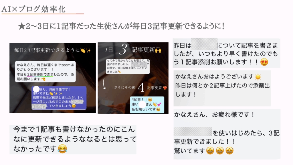 AIは難しそうなイメージはありましたが、実践形式でレクチャーしていただいたおかげで、文章を書くのが苦手だった私でもスムーズに記事作成ができるように。