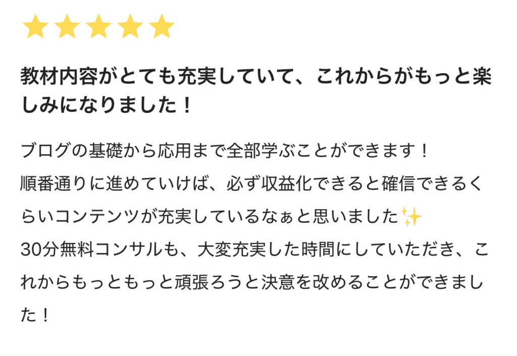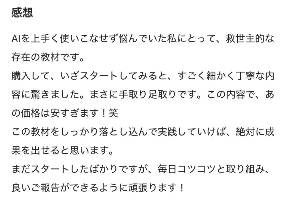 ブログもAIもまったくの未経験でしたが、教材の通りに進めていくだけで、こんな風にやればいいんだってすぐにイメージができました!また動画で解説してくれるため、初心者の私でも理解ができます♪